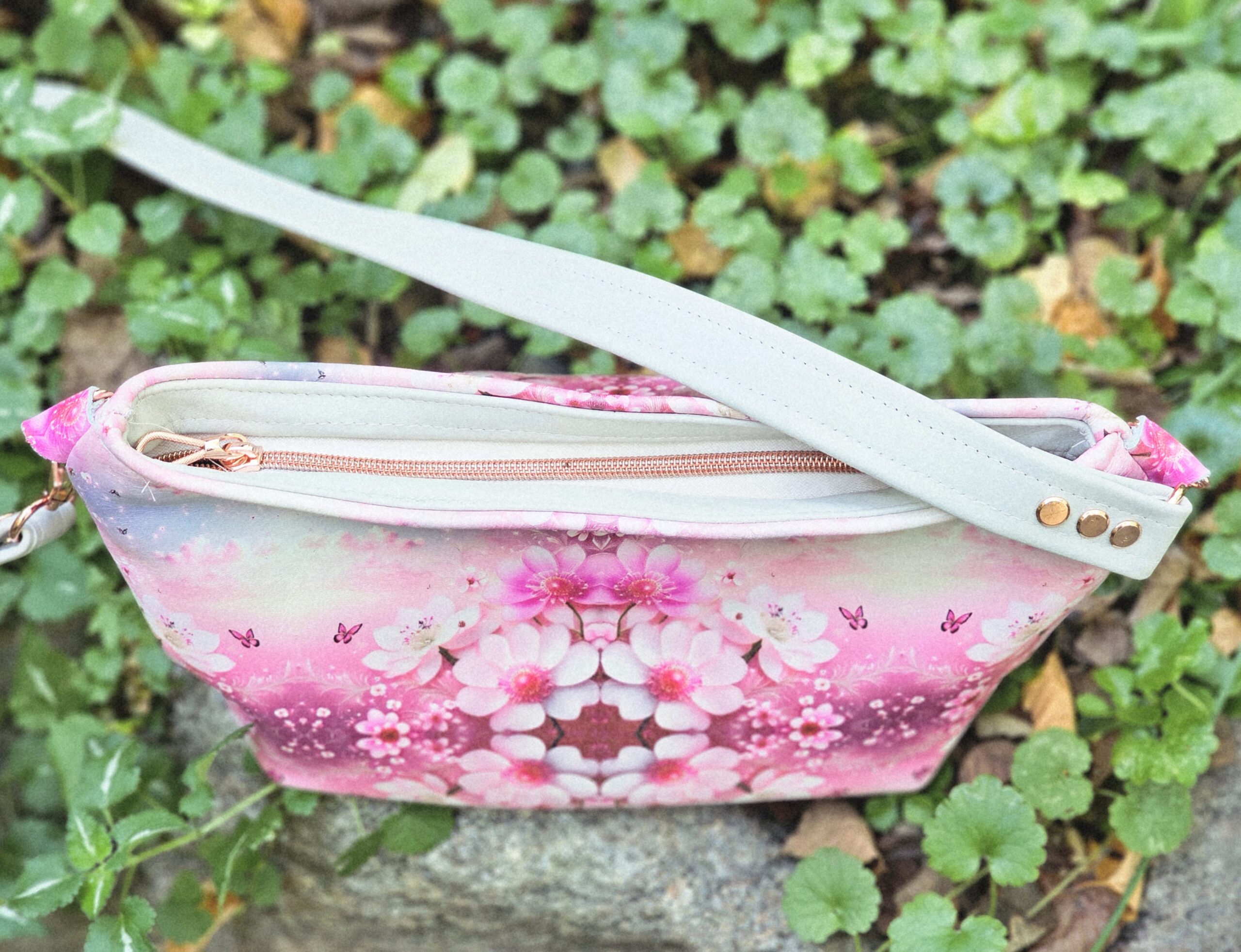 The inside is one of my fabric designs on denim from Spoonflower.