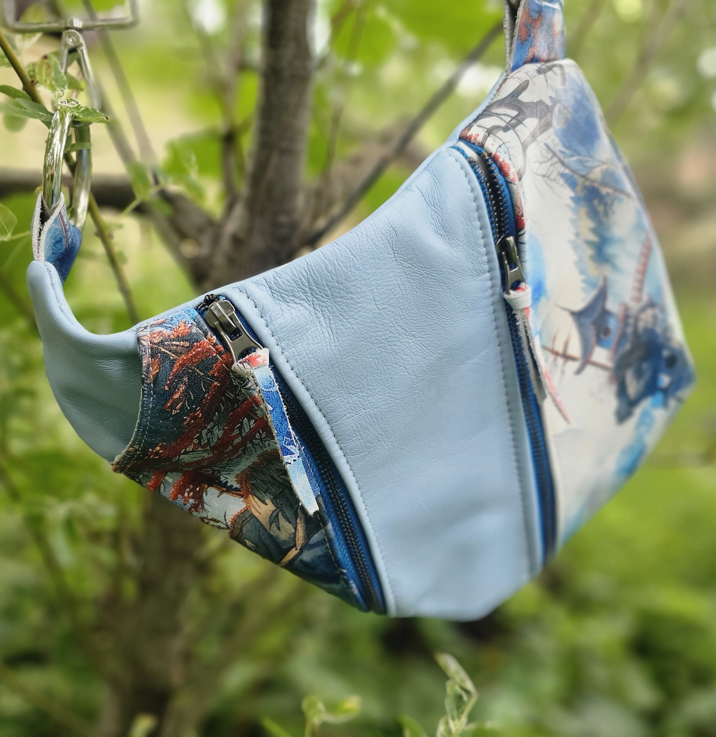After making the one above, I wanted to make another one. I bought this design printed scrap leather and had another leather that matched it. The inside is a soft grey satin.